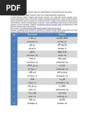 Hukum nun mati dan tanwin dalam al qur'an berdasarkan ilmu tajwid yang terdapat 5 hukum. Menerapkan hukum bacaan idgam bigunnah, idgam bilagunnah, dan iqlab. Contoh:==ni terjadi apabila nun mati atau tanwin bertemu dengan huruf ba' (ب). Izhar halqi, idgham, ikhfa haqiqi, iqlab. Pengertian, cara membaca dan contoh hukum bacaan iqlab.