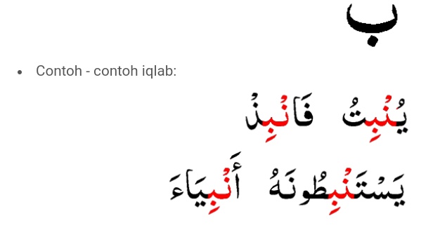 Iqlab adalah suatu hukum bacaan alquran yang terjadi apabila nun mati atau tanwin bertemu dengan satu huruf saja yaitu huruf ba'.